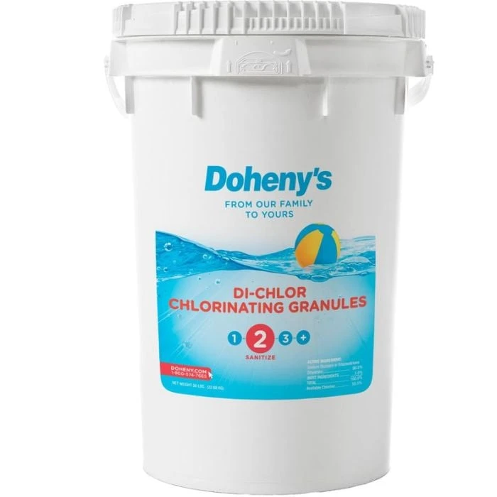 Doheny’s Di-Chlor granular chlorine features 56% available chlorine to destroy bacteria in a hurry and it’s calcium free, so there’s no need to worry about clouding. Doheny’s Di-Chlor granular chlorine should not be used in a daily chlorinator. If your chlorine level is low, use Di-Chlor to quickly raise the chlorine level without raising the pH level in the pool.